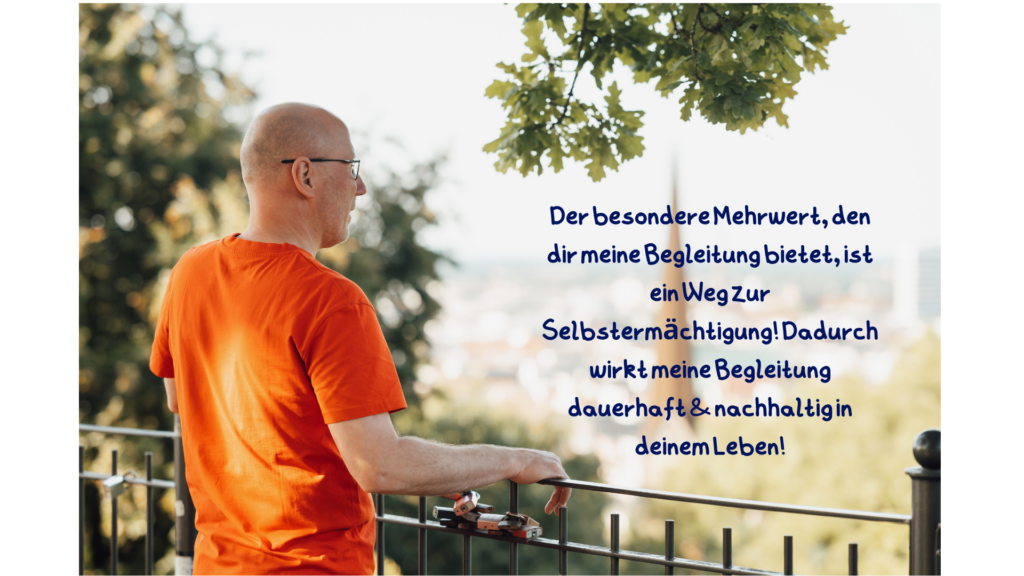 D.h., anders als in vielen anderen Seminaren, Workshops und Coachings, leite ich dich an, Werkzeuge und Techniken zu erlernen, mit denen du zukünftig dein Leben selbst gestaltest. Du brauchst keine dauerhafte Begleitung, sonder höchstens noch punktuelle „Updates“.
