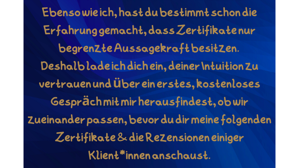Meine wichtigste Qualifikation, um dir tatsächlich konkret dienlich sein zu können, ist meine umfassende Lebenserfahrung. Ich habe, neben diversen erfolgreich gemeisterten körperlichen, beruflichen und privaten Krisen, viele Erfahrungen in Führungsverantwortung und der Verantwortung für eine Familie gesammelt!